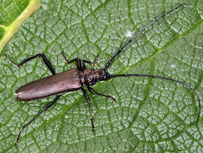 While doing volunteer work at Shapwick National Nature Reserve, I was suddenly forced to stop the reed cutting machine that I was operating when I noticed that the last bunch of reeds and other waterside vegetation that I had mown through had a large struggling insect trapped in their stems. I was overjoyed on uncovering it to see it was the large longhorn beetle, Aromia moschata. This insect lays its eggs on the branches of Sallow bushes and the larvae burrow inside the branch to grow. The adults often visit flowering plants and this was obviously what this beast had been doing before its lunch was so rudely interrupted. After photography and parading before the rest of the group and several amazed passing visitors, the beetle was released back to the relative calm of the reedbed.
